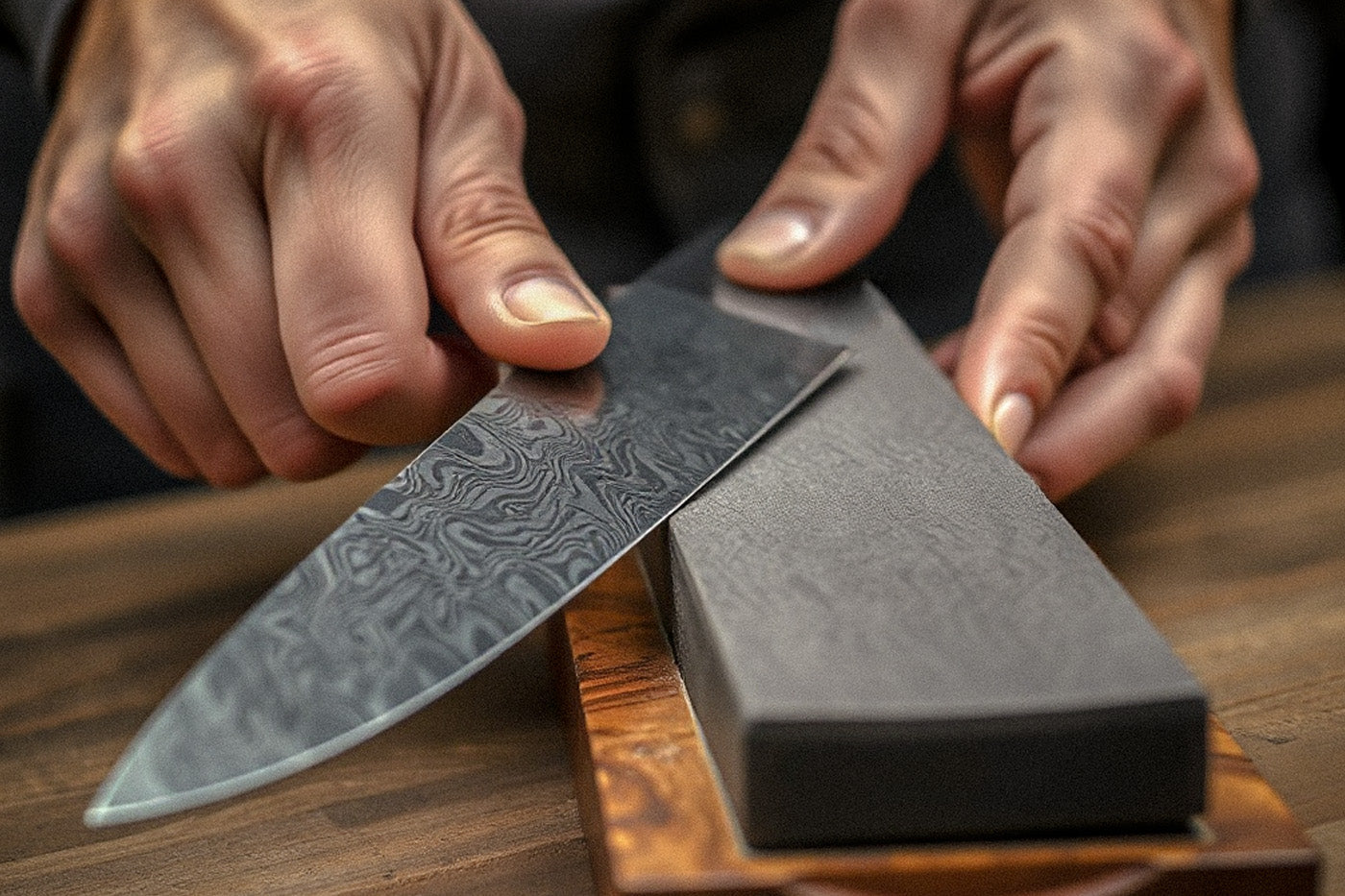 In den letzten Schritten wird die Klinge nochmals feingeschliffen und sorgfältig geschärft, um die finale Schneidequalität zu gewährleisten. Dies erfolgt oft in mehreren Schleifphasen, von grob bis extrem fein, um eine optimale Schärfe und Langlebigkeit der Schneide zu garantieren.