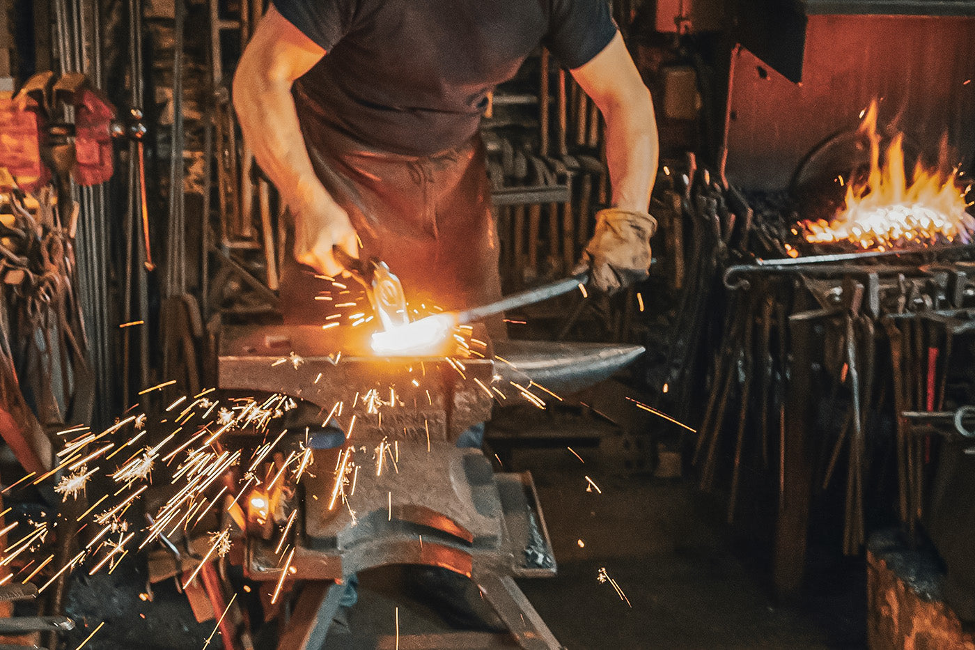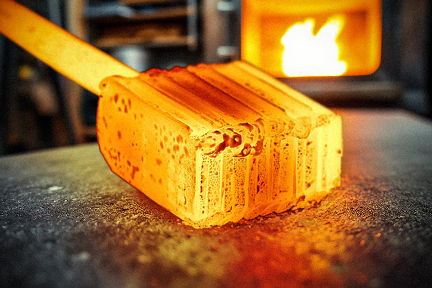 Die ausgesuchten Stahlschichten werden übereinandergelegt und verschweißt. Der Stahlblock wird dann wiederholt erhitzt, gestreckt und gefaltet, was das charakteristische Damastmuster erzeugt. Dieser Faltprozess sorgt für die Homogenität der Materialstruktur und erhöht gleichzeitig die Flexibilität und Härte des Stahls. Eine präzise Steuerung der Anzahl der Faltungen ist wichtig, um die gewünschte Lagenanzahl und Struktur zu erreichen.