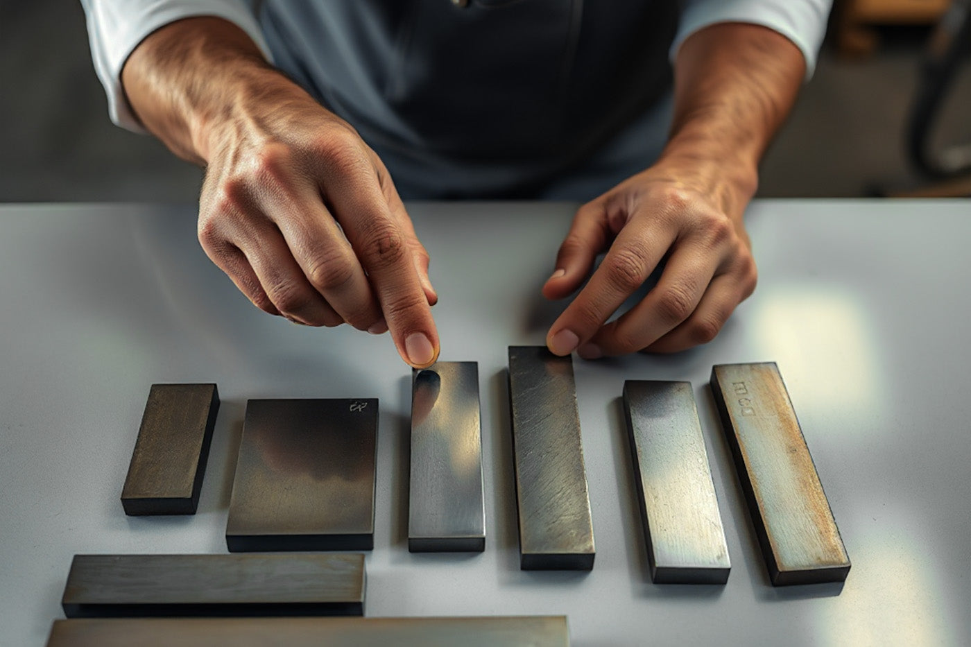 Der Prozess beginnt mit der Auswahl geeigneter Stahlsorten. Für Damastlaminat werden in der Regel zwei oder mehr verschiedene Stahlsorten verwendet: eine harte, kohlenstoffreiche Stahlsorte für die Schnitthaltigkeit und eine zähere, weichere Stahlsorte für die Flexibilität. Die Kombination dieser Stahlsorten ist entscheidend für die spätere Funktionalität der Klinge.